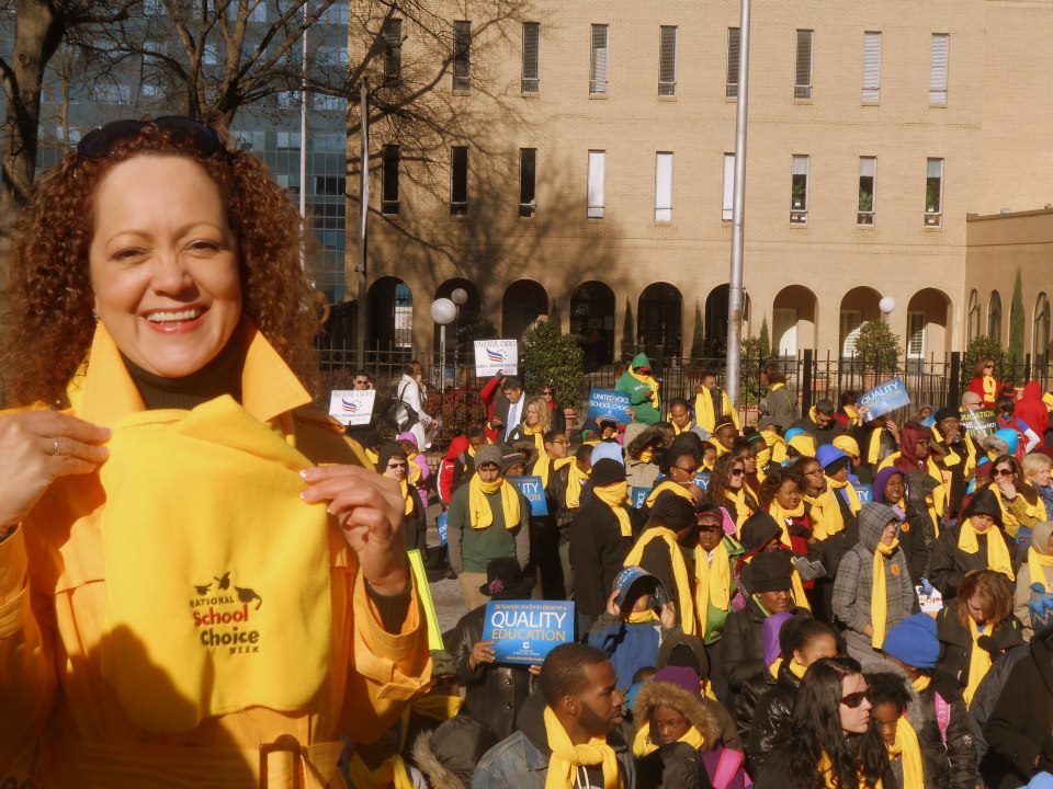 Foundation Vice President Benita Dodd shows off the trademark school choice "woobie" at a National School Choice Week Celebration rally […]