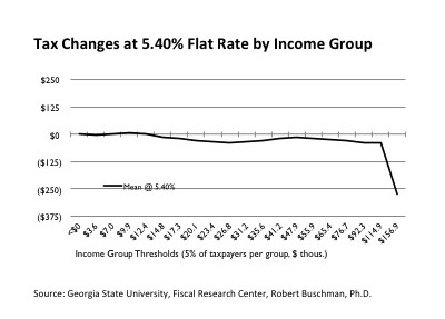 So under this proposal, an average family of four that itemizes would pay no tax on the first $34,000 of income. (Median household income in Georgia is around $49,000. The total deductions and exemptions from the third and fourth columns in the tables above under this proposal are $34.121 and $34,559, respectively.)
