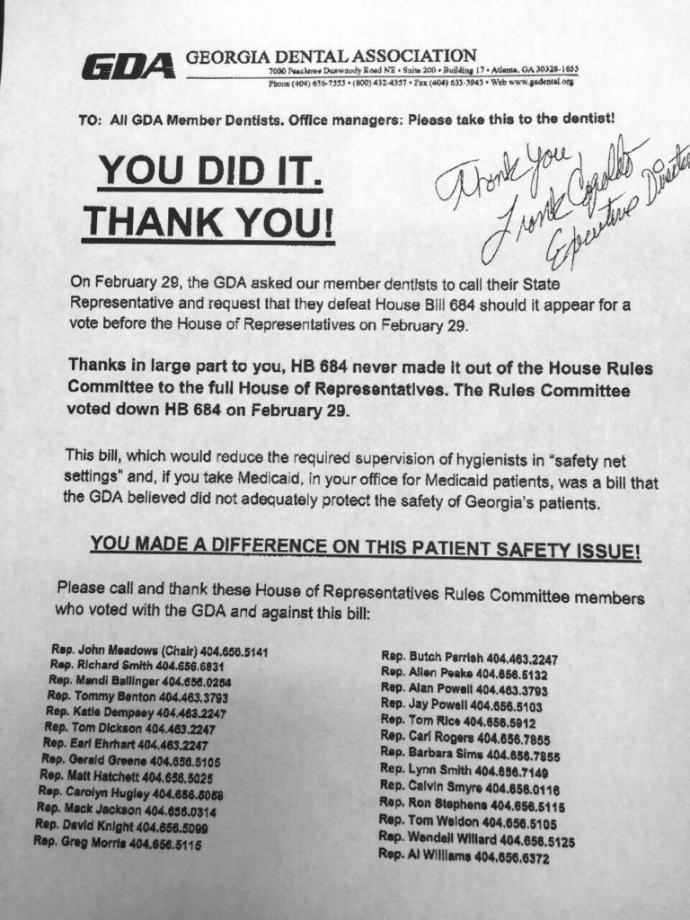 - In 2016, legislation was introduced to enable dental hygienists to serve Medicaid patients and low-income patients in safety-net settings without the direct (in-the-building) supervision of a dentist. In 2016, there were just 5,088 active dentists in Georgia, which has more than 10 million residents. The bill died in committee, fought by the Georgia Dental Association.