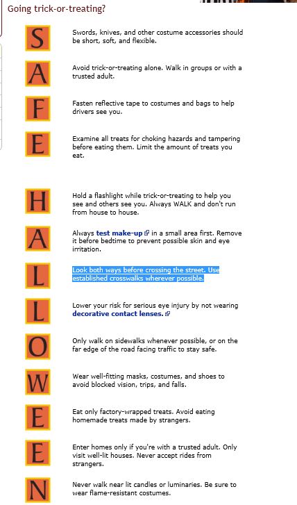 I know you’re worried the Centers for Disease Control and Prevention is botching its handling of Ebola, but never fear! The CDC has Halloween covered for you! In fact, the agency even paid someone to write advice for each letter in SAFE HALLOWEEN. As in, “Hold a flashlight” for “H'” and, “Look both ways,” for “L.”