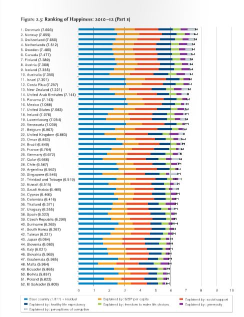 2013 ranking of countries, if more people had access to good, cost-effective treatments for depression, anxiety disorders and psychosis. It notes there is some evidence of global convergence of happiness levels, with happiness gains more common in Sub-Saharan Africa and Latin America, and losses more common among the industrial countries. (Too blasé in the developed world?) The 2013 report identifies the countries with the highest levels of happiness in the 2010-2012 surveys. Denmark ranked first, followed by Norway, Switzerland, the Netherlands and Sweden. The United States ranked 17th. The six key variables in rankings over time and among countries are real GDP per capita; healthy life expectancy; having someone to count on; perceived freedom to make life choices; freedom from corruption; and generosity. Health + Wealth + Liberty = Happiness Source: EHS Today