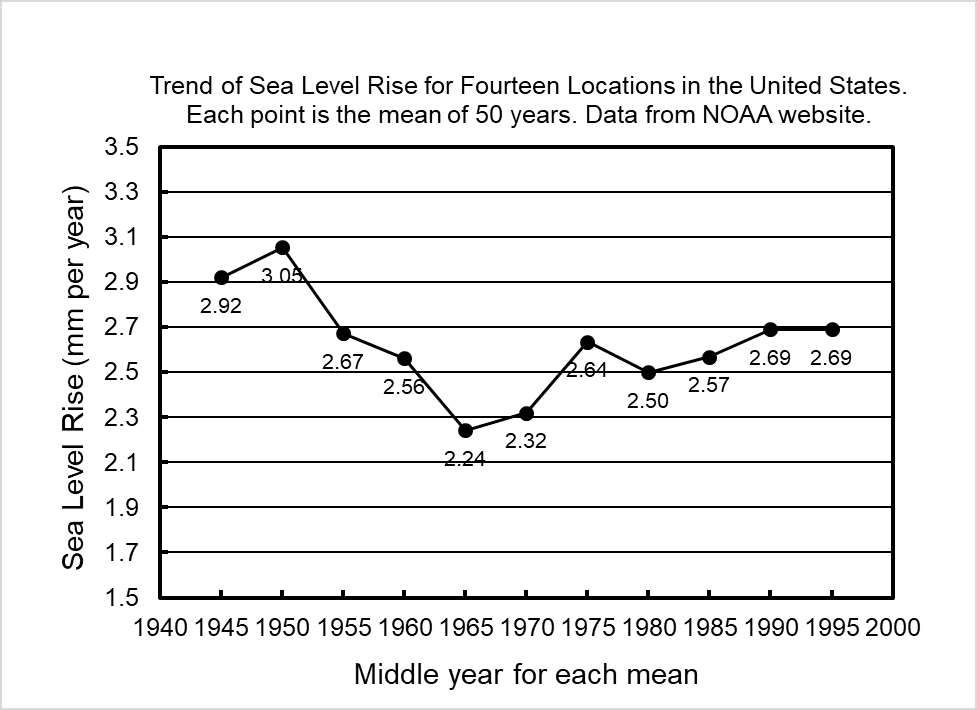 The variability associated with the small rate of sea level rise requires long periods of measurement to establish trends. NOAA publishes 50-year means on its website to show trends. Averaging data for the 14 U.S. stations with measurements extending back at least to 1920 makes it clear that U.S. sea level increases are not greater in the most recent 50 years than in mid-century (see chart).