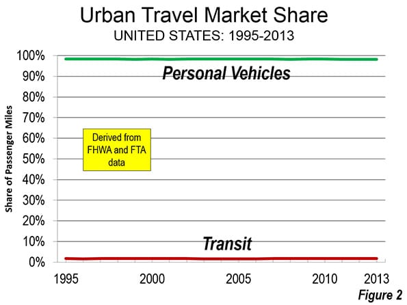 Not so, as Wendell Cox pointed out in Joel Kotkin’s New Geography website and planning professors David King, Michael Manville and Michael Smart write in the Washington Post. In their view, the idea that the United States is seeing a vast boom in mass transit use is way overblown. The three professors note that, since population is rising, transit trips per capita actually declined slightly between 2008 and 2013. “There is nothing exceptional about last year’s numbers,” they write. “They represent a depressing norm.” Cox concedes that transit ridership has grown faster than vehicle use since 1995, but points out that its share of urban travel has barely budge, “because its 1994 share of travel was too small.” He presents the following graph, which tells the story: