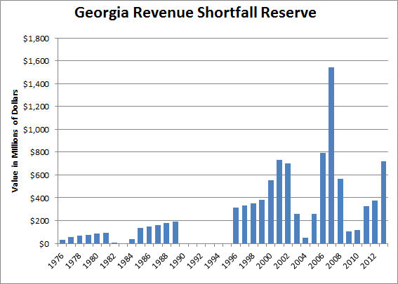 Georgia’s rainy day fund – Revenue Shortfall Reserve in government speak – could approach the $1 billion mark this year – a long way back from where the account found itself during recession when rainy day funds paid real bills and nearly exhausted the state’s operating surplus. The high water mark was $1.544 billion in Fiscal 2007.