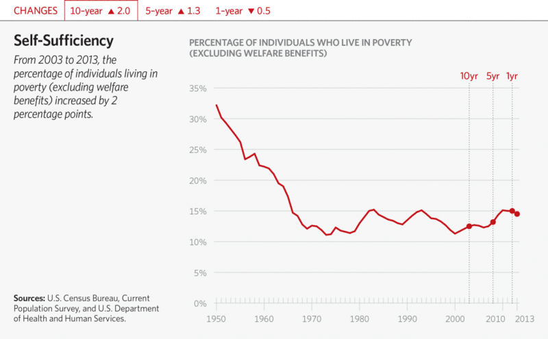 War on poverty: In 2014, on the 50th anniversary of the War on Poverty, the Foundation commentary noted, “Improving education opportunities has a far greater effect on closing the income gap and increasing upward mobility than does a government handout.” The accompanying graph from the Heritage Foundation highlights how America is losing the war on poverty.