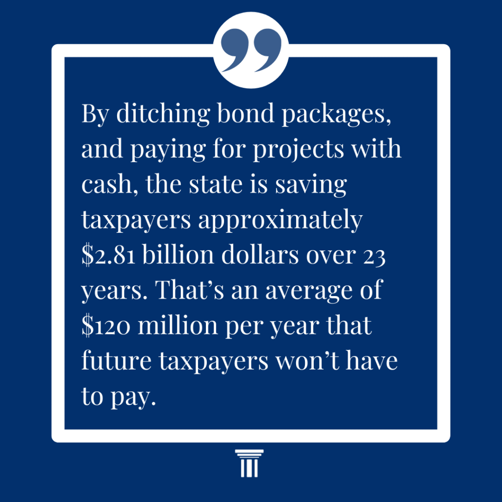 The budget year that begins July 1 will be the third straight with no “bond package,” as that section is typically called. Instead, over the course of three years the state has paid cash for projects totaling $3.45 billion. The savings to taxpayers comes from the interest payments they’ll never have to make.