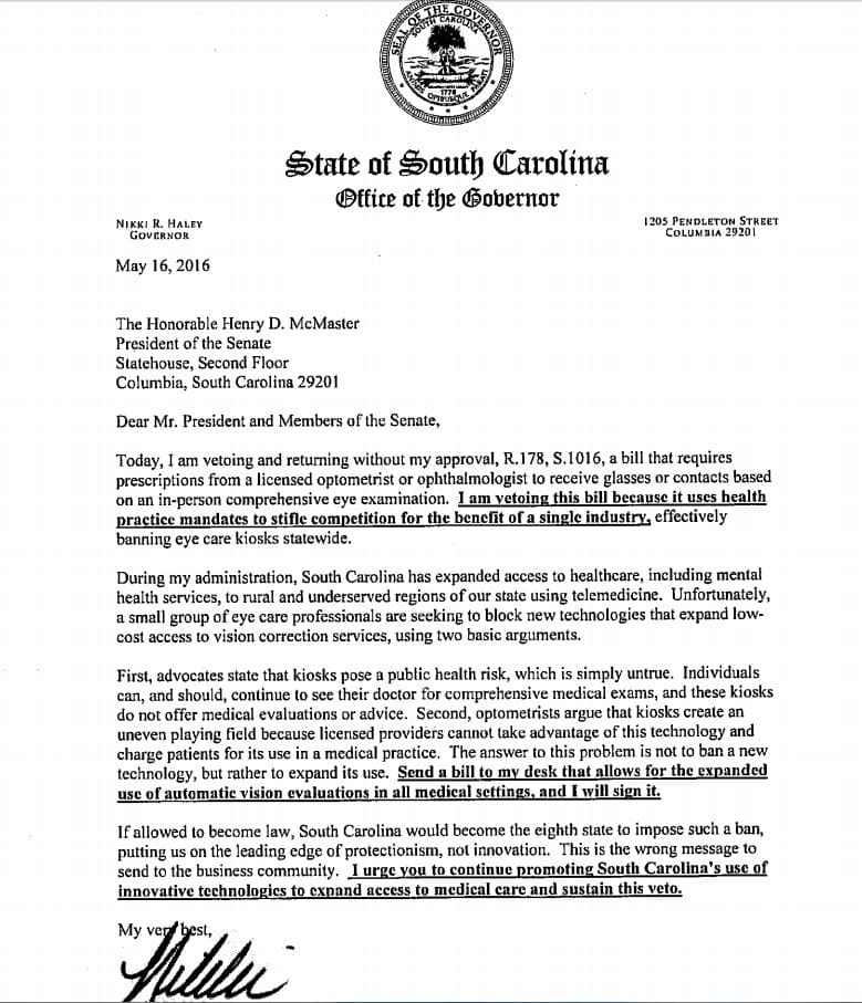 Embracing innovation: Georgia legislators were first in the nation, unfortunately, to ban an innovative online vision care service. In South Carolina this week, Gov. Nikki Haley vetoed similar legislation, “because it uses health practice mandates to stifle competition for the benefit of a single industry … a small group of eye care professionals is seeking to block new technologies that expand low-cost access to vision correction services.”