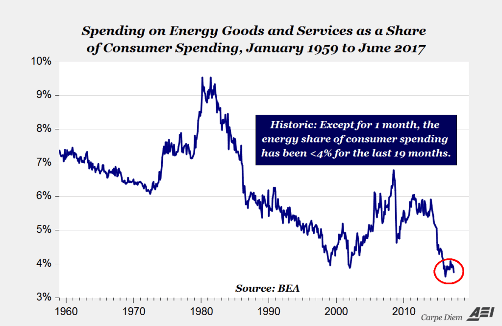 Low energy: Thanks to the revolutionary technologies that accessed oceans of shale oil and gas, energy abundance has led to the cheapest energy in history, and in the process raising our standard of living a little bit higher, the American Enterprise Institute reports. In 18 of the past 19 months, starting in December 2015, the energy share of consumer spending has been below 4 percent, marking a historic period of the most affordable energy in U.S. history!
