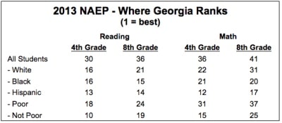 That K-12 academic achievement is a struggle in Georgia is indisputable. There is plenty of room for improvement. But just how are students doing? This chart focusing on Georgia rankings in the National Assessment of Educational Progress (NAEP), the only common metric for all states, paints a clearer picture.