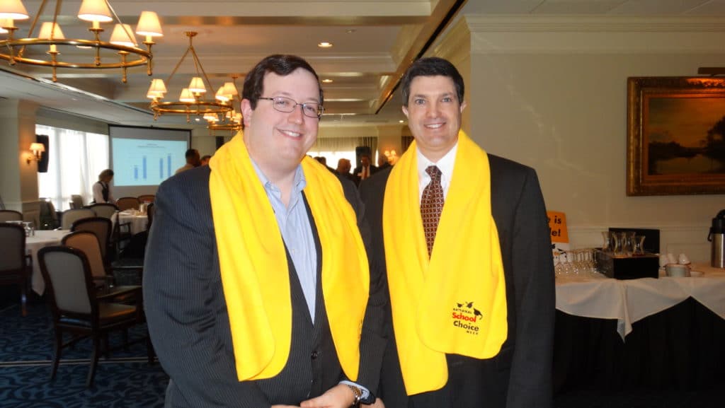 Georgia State Senator Josh McKoon and Foundation President Kelly McCutchen wear their National School Choice Week “woobie” at the Foundation’s annual event on January 21.