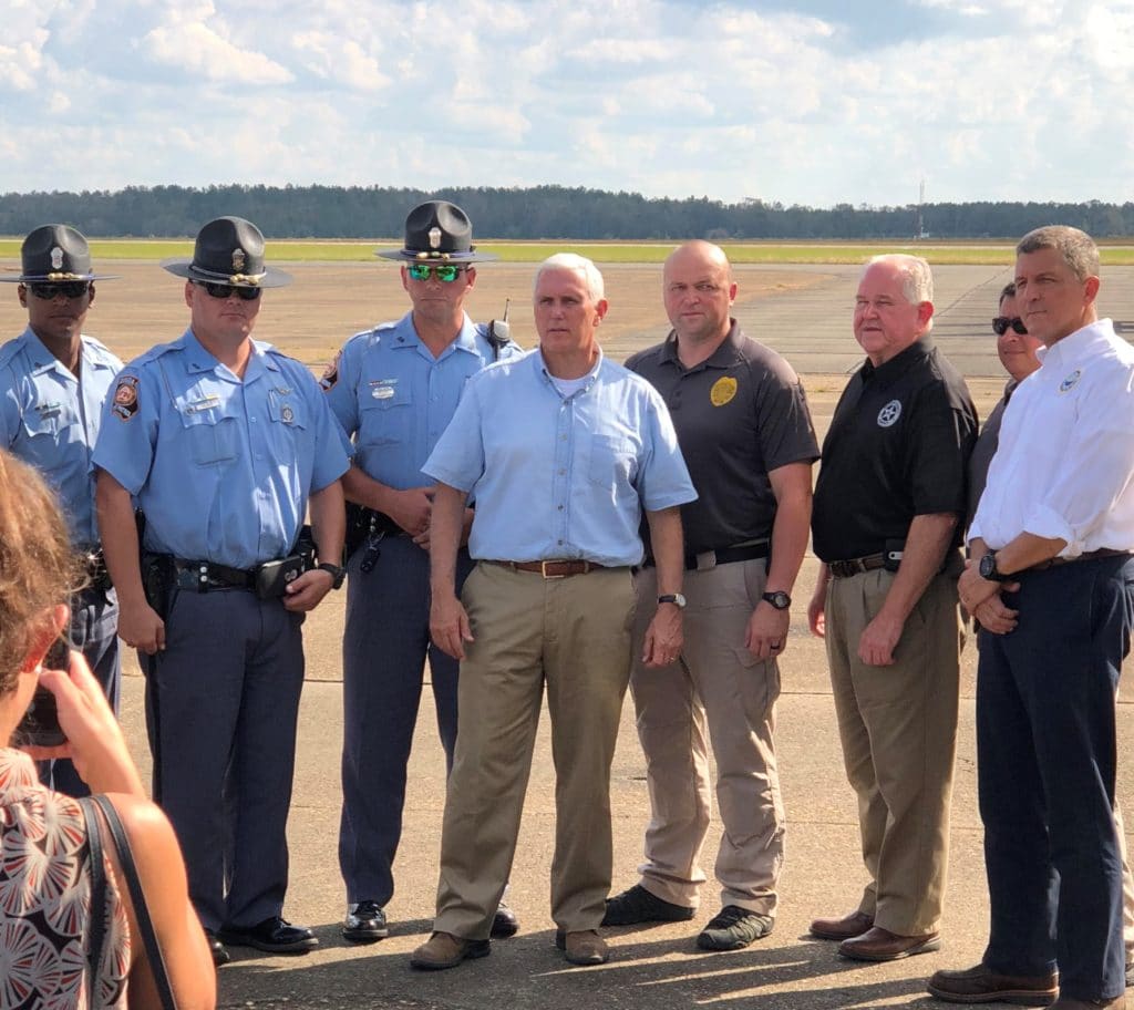 Vice President Mike Pence, who visited South Georgia this week to tour the area devastated by Hurricane Michael, pauses briefly for a photograph with Georgia law enforcement officials . (Photo credit: Joseph Brannan)