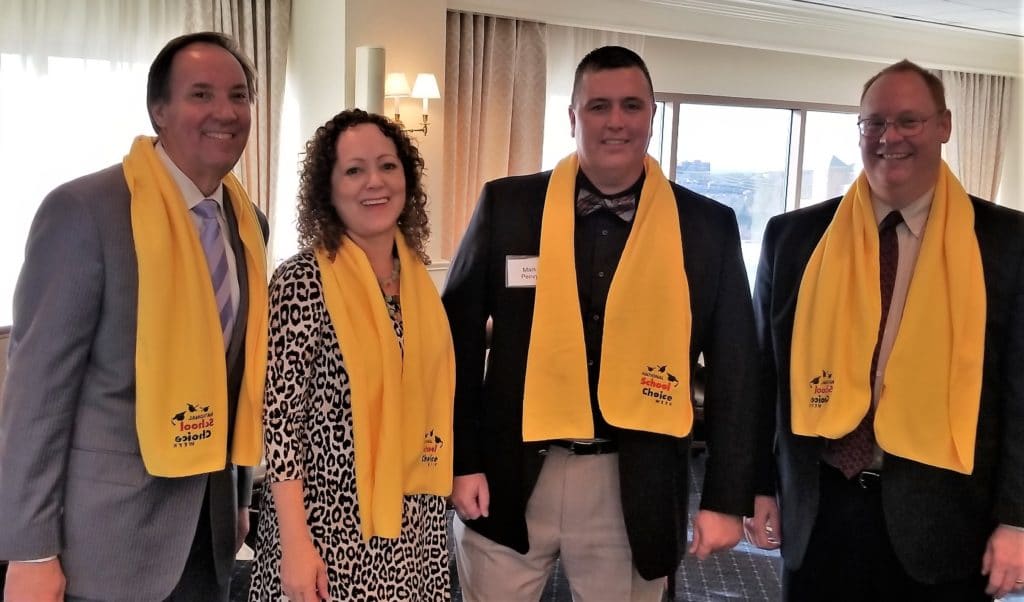 Showing off their trademark National School Choice Week scarves at the Georgia Public Policy Foundation’s event are Scott Johnson, State Board of Education member; Foundation Vice President Benita Dodd; Mark Peevy, Executive Director of Secondary Education Initiatives at the Technical College System of Georgia; and keynote speaker Dr. Ben Scafidi, education expert and professor of economics at Kennesaw State University.