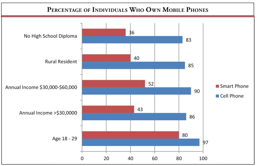 However, low-income populations have a high penetration of mobile phones. The Pew Research Center says that