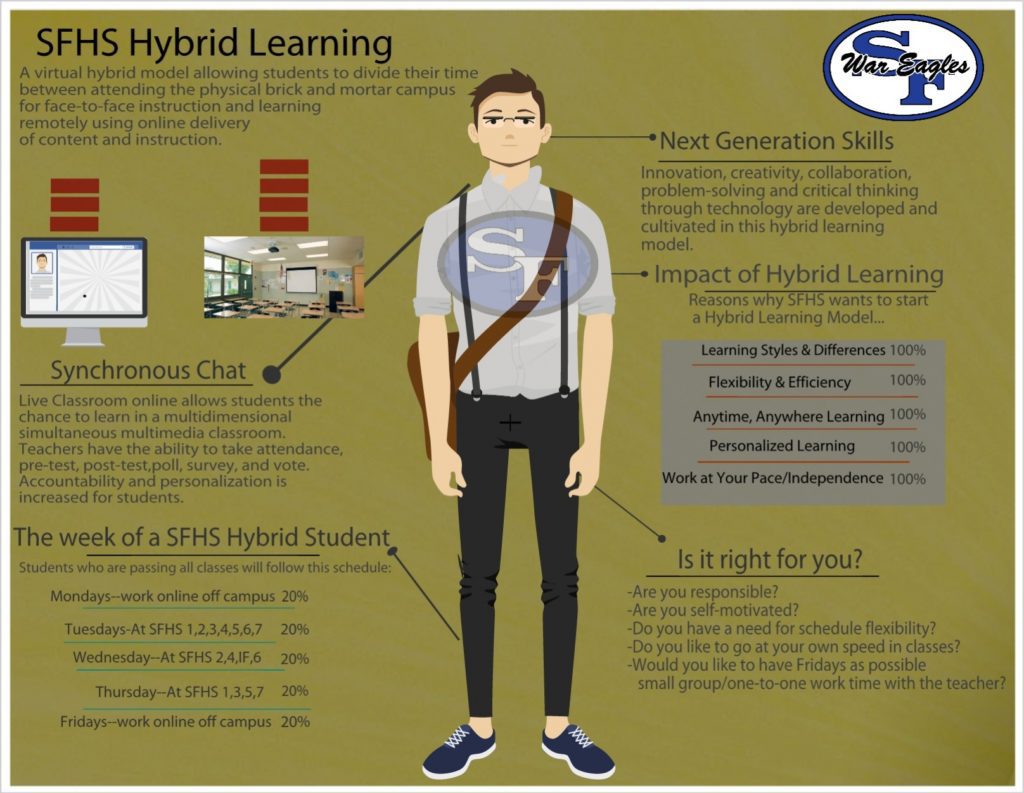 - Fridays would be asynchronous learning days. Students would have lesson plans and know what work needed to be done on these days, but would not have to check into the course website each period. They could complete all of their work quickly and be free the rest of the day. They could work all day long, taking breaks as they needed to. They could meet up with other students and work on projects or study together. One SFHS expectation is that if a student’s grade falls below a 75, that student would have to physically come into school on Friday until their grade recovered. But that’s not a punishment; if only two or three have such low grades, the teachers will be free to work with them in very small groups, or individually, as the rest of the class will be working from home that day.