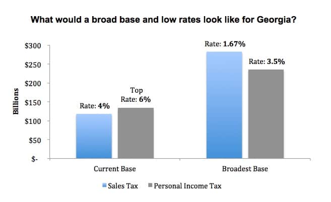 For the sales tax, it would mean taxing the retail sale of all goods and services equally, similar to proposals like the Fair Tax. This would more than double the sales tax base, according to Georgia State University’s Fiscal Research Center. The state sales tax rate could be cut by more than half, from 4 percent to 1.67 percent, and still bring in the same revenue.