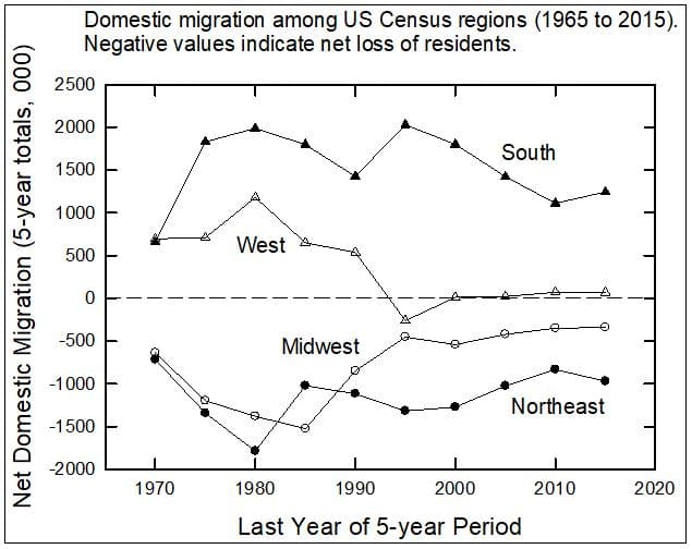 The Northeast and Midwest census regions, consisting of 21 states, had a net loss of 19 million domestic migrants since 1965 (up to 2015, see nearby chart). That’s about twice as many people as the South lost through migration in the first half of the 20th century. The migrants lost by the Northeast and Midwest since 1965 were, of course, gained by both the South and the West, but the South won 80 percent of the movers. Since 2000, the South received 86 percent of those migrants.