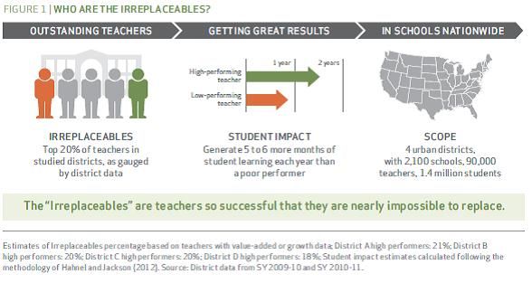 Those whose students gained 5-6 more months of learning each year compared to lower-performing teachers were deemed “Irreplaceable” – about 20 percent of the teachers in each of the school systems TNTP examined.