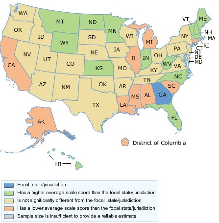 So in summary, except for low-income students in math, Georgia’s 4th graders consistently outperform about a third to a half of the states, and only a handful of states can say they are performing statistically better than Georgia.