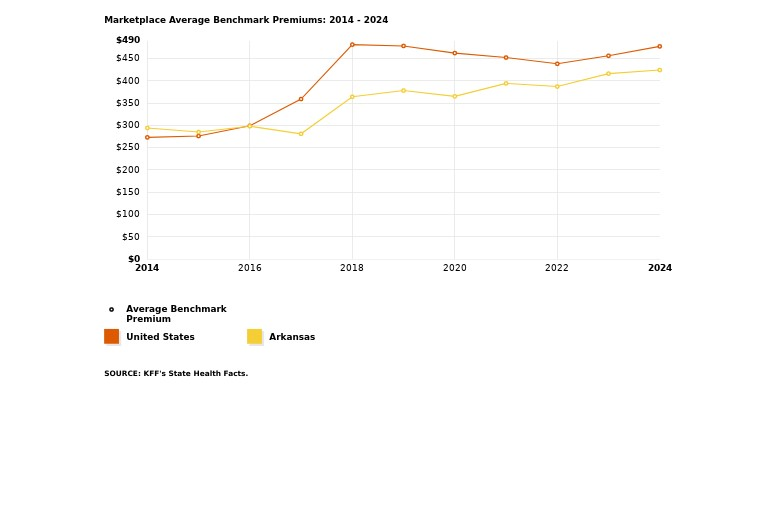 During the period from 2014-2024, the average benchmark premium in Arkansas has increased by 44 percent, from $294 to $424. By comparison, the average benchmark premium in the U.S. increased by 74 percent, from $273 to $477, from 2014-2024. For additional reference Georgia, which is not depicted in the chart above, experienced a 59 percent increase during the same period, from $291 to $463.