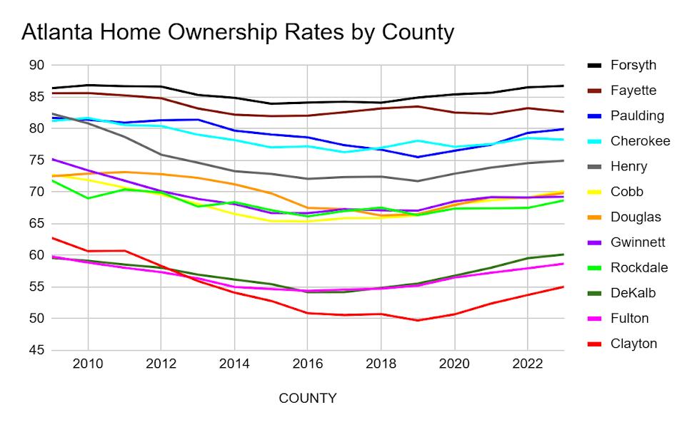 He also points out that homeownership rates in metro Atlanta have been increasing at a steady rate of about 0.3 percent annually since the after-effects of the mortgage shock ended (the outlier seen in the 2020 homeownership rate is attributed to the Census Bureau halting data collection during the COVID-19 pandemic).